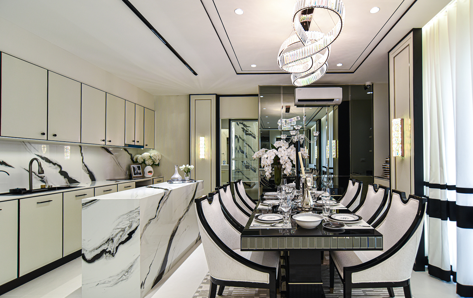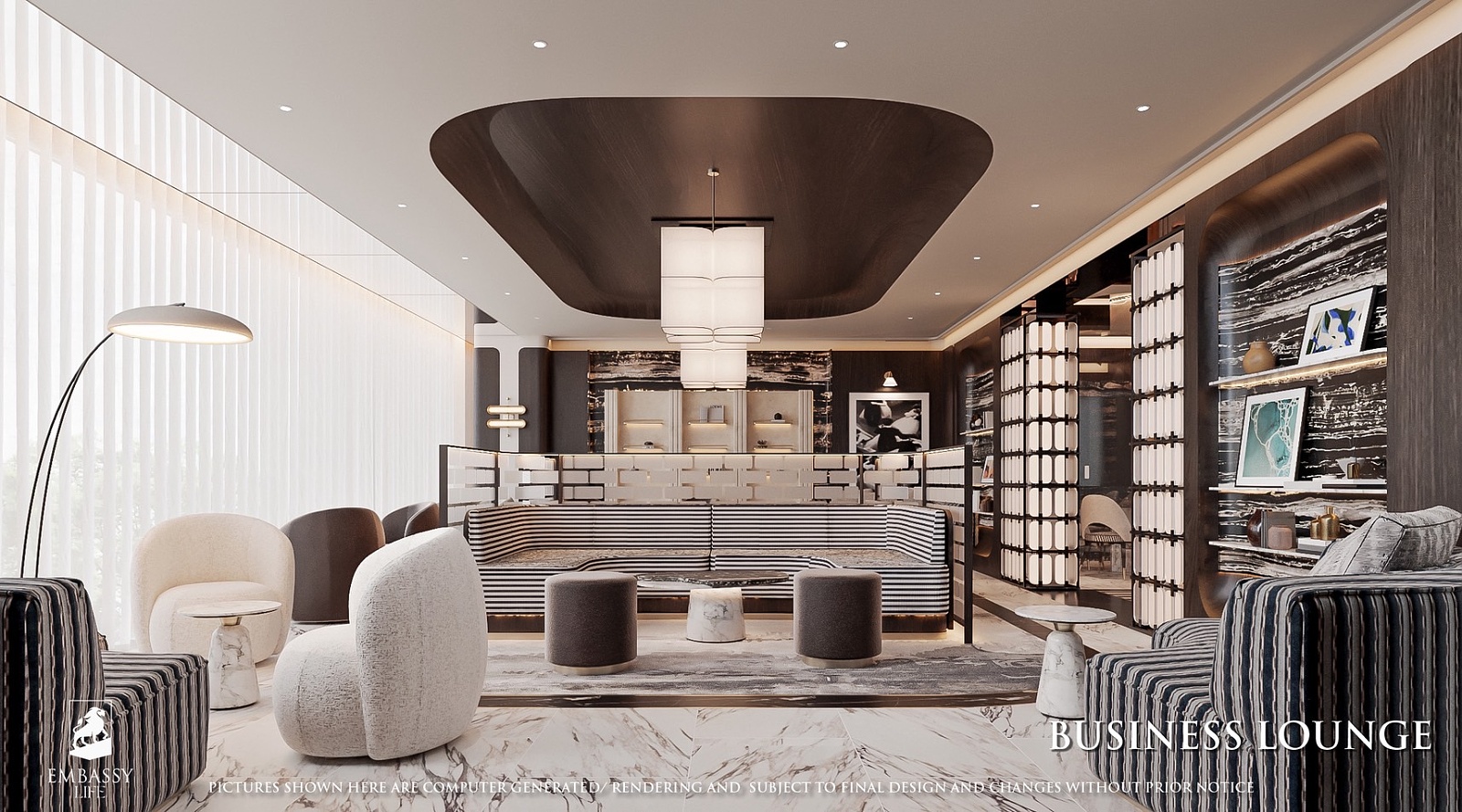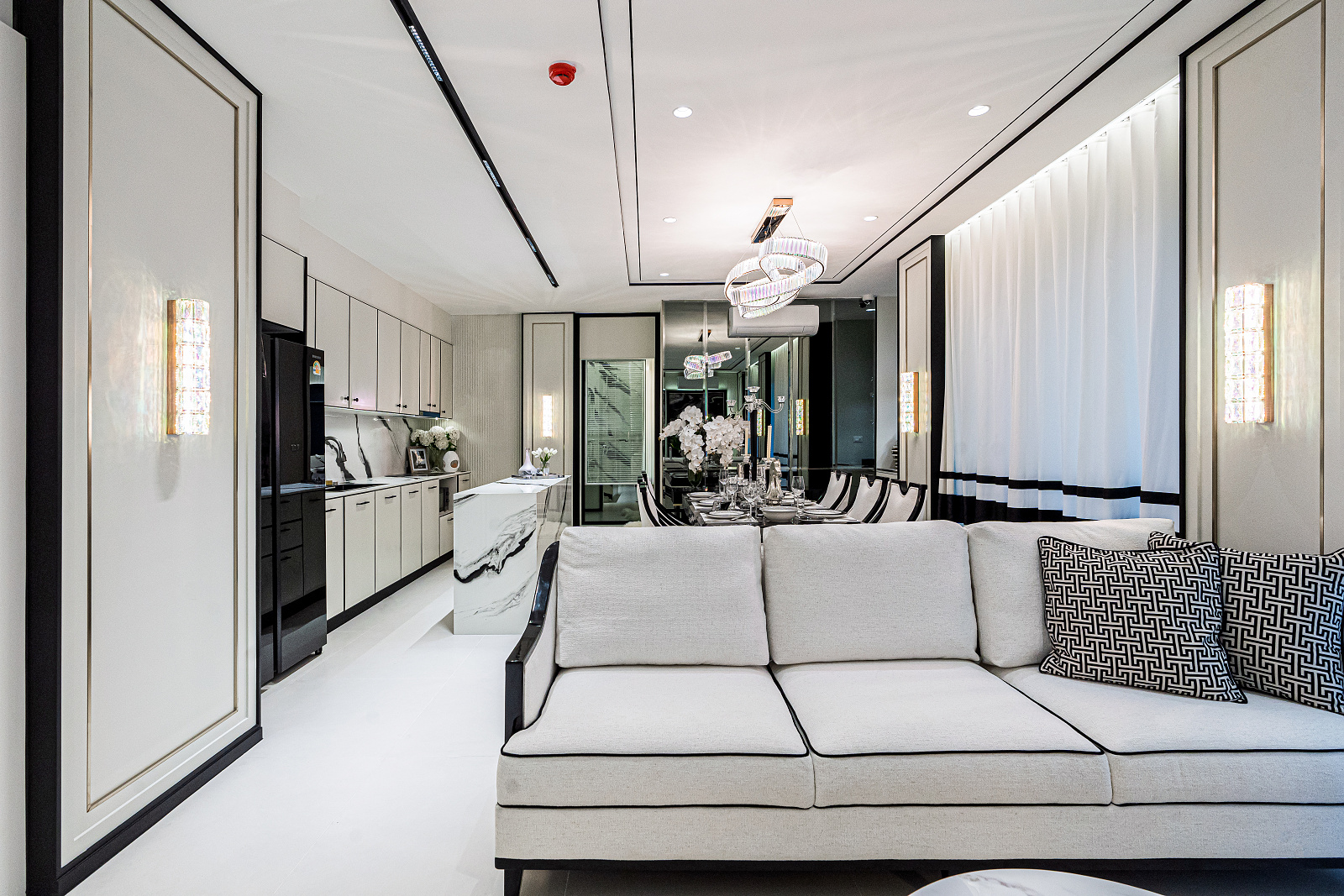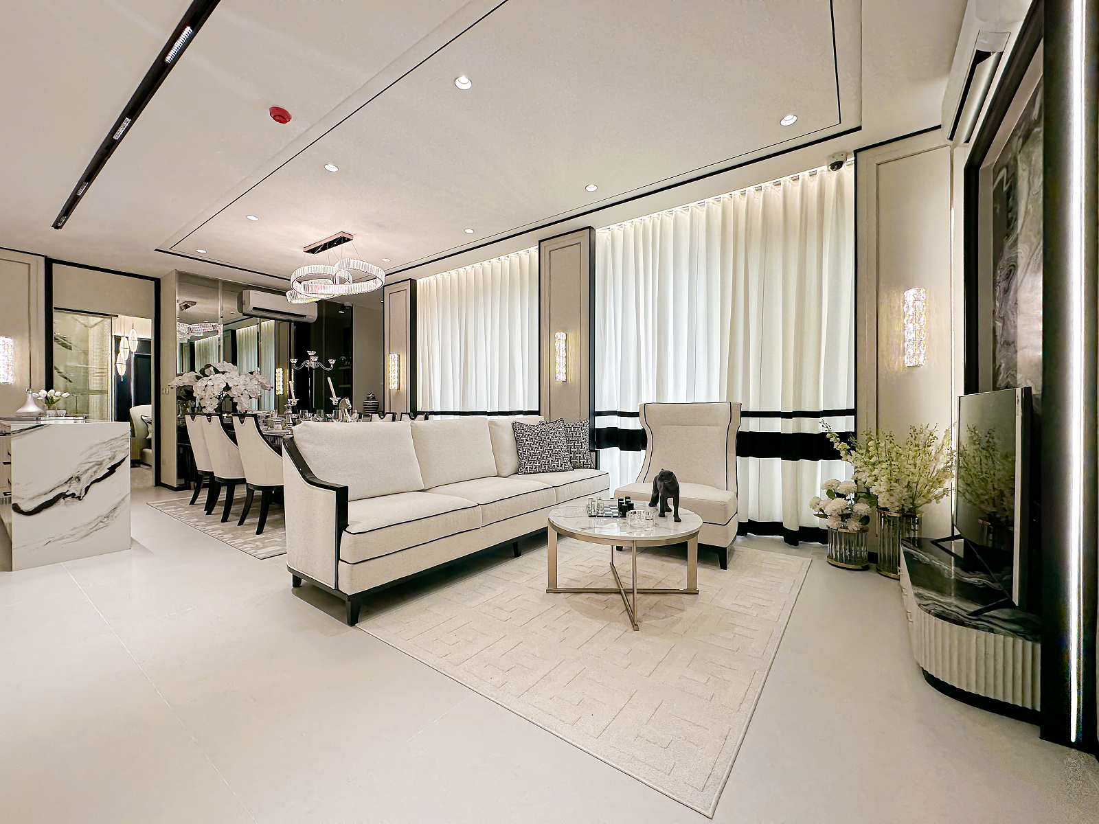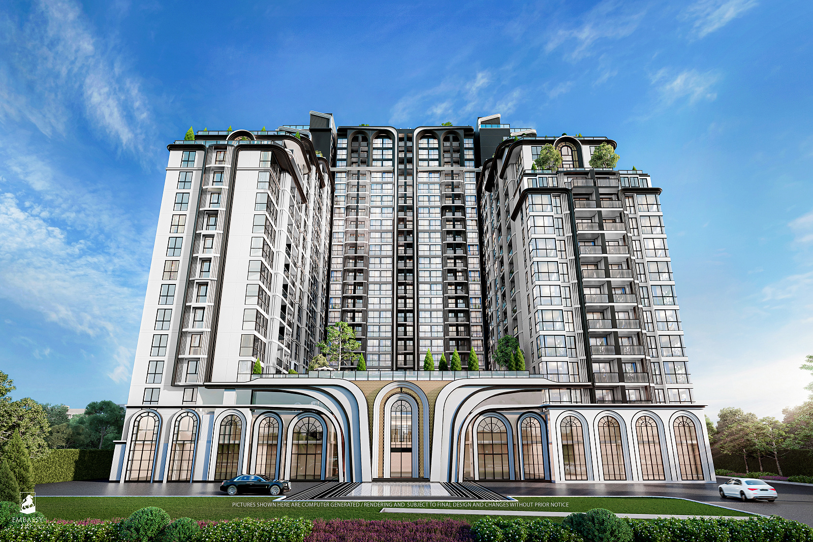 Každá rezidencia je inšpirovaná nadčasovou výzdobou v štýle Embassy s rafinovanou čierno-bielou estetikou, ktorá vyžaruje eleganciu a rafinovanosť. Okná siahajúce od podlahy po strop rámujú ohromujúce panoramatické výhľady, či už uprednostňujete pohľad na iskrivé more, príjemné bazénové oblasti alebo pulzujúce mesto pod vami.