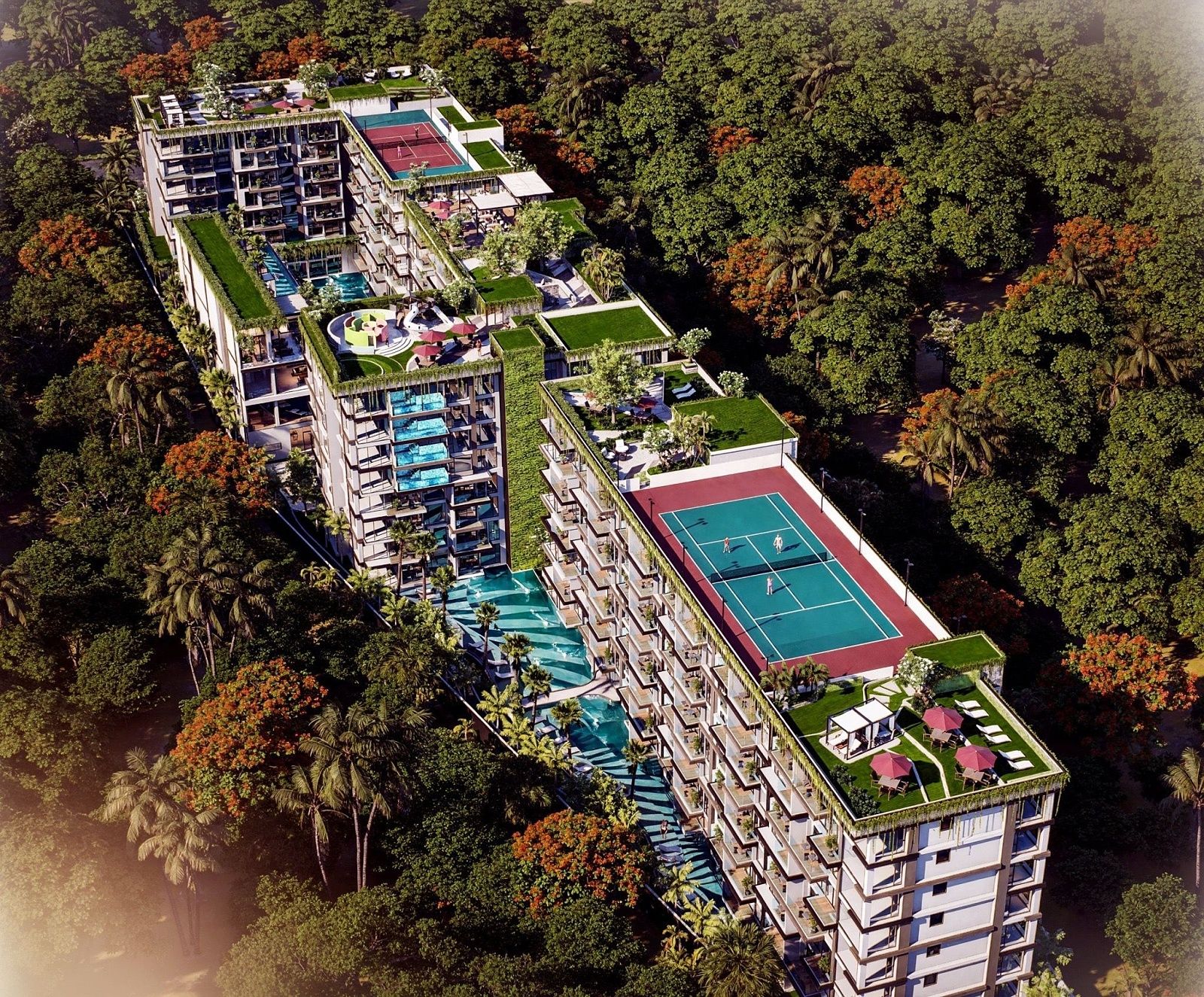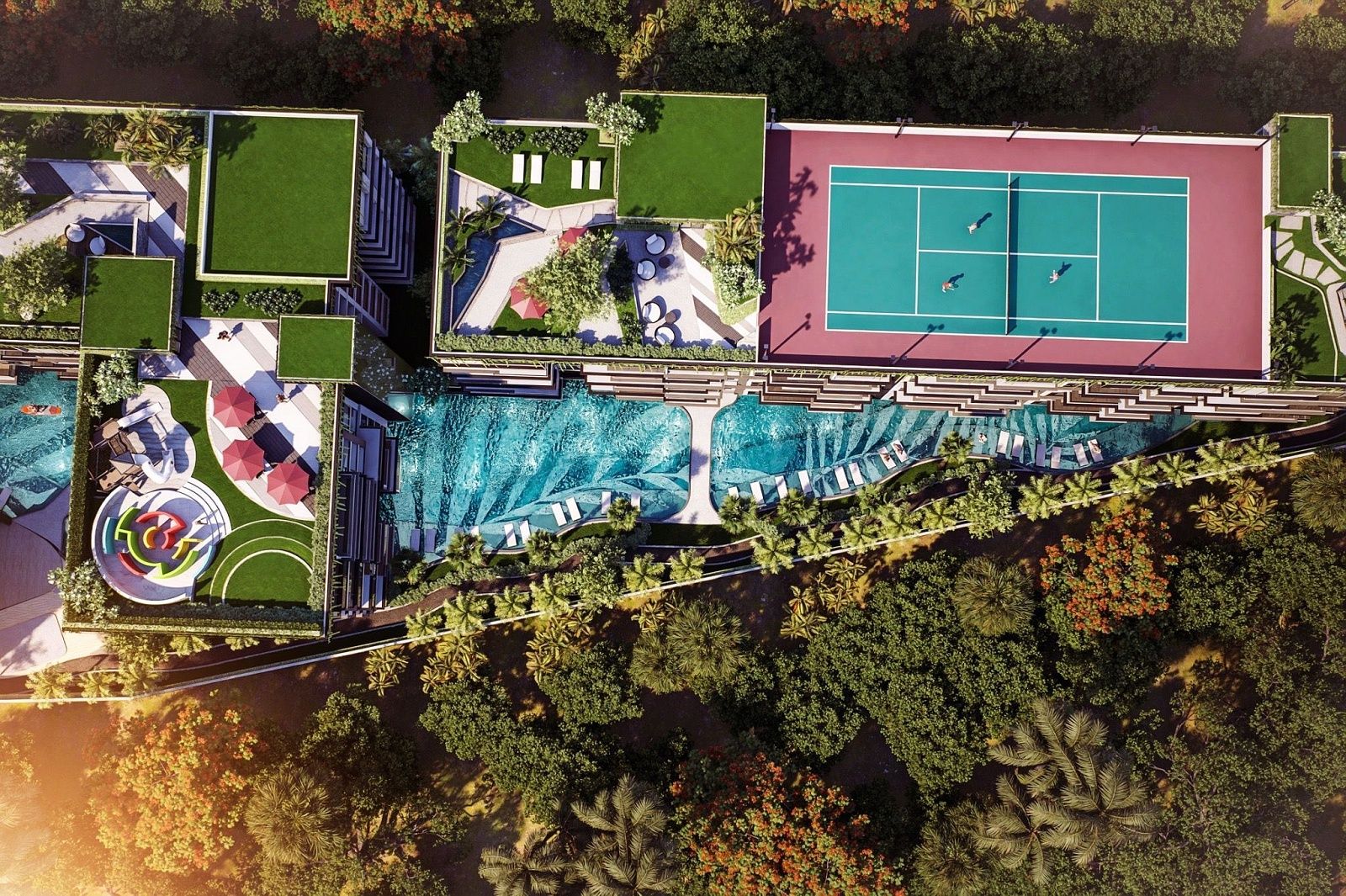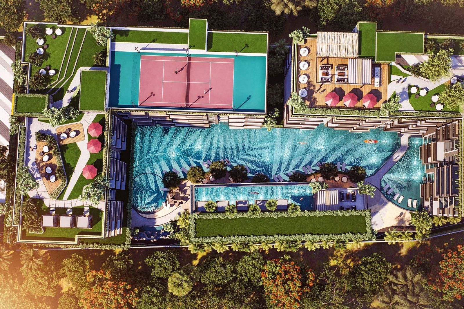 Okrem čistej relaxácie poskytuje clubhouse komplexné fitness a rekreačné možnosti. 24-hodinová posilňovňa je vybavená najmodernejšími strojmi, boxerským ringom a spinning štúdiom a obyvatelia môžu zdokonaľovať svoj swing v golfovom simulátore alebo viesť stretnutia s klientmi v súkromných obchodných miestnostiach. Večery ožívajú v zábavnom salóniku alebo hore na streche, kde nekonečný bazén a sunset bar rámujú panoramatické výhľady. Každá z troch obytných budov pridáva svoje vlastné súkromné vybavenie – pickleball kurty, detské zóny, strešné záhrady a tenisové kurty – čím zabezpečuje, že každý obyvateľ nájde dokonalý sposôb, ako sa uvoľniť alebo zostať aktívny.